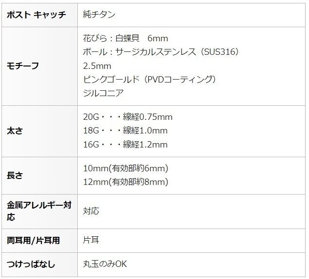 丸玉・・・サージカルステンレス(S: 2.5mm、 M: 3.0mm)カラー: ゴールド