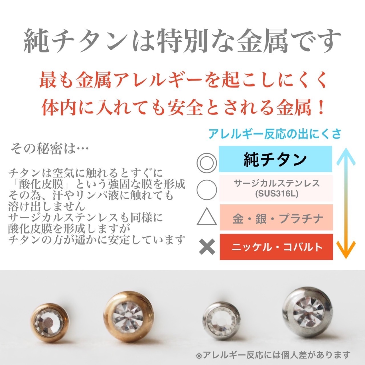 チタンなのにアレルギー反応が出た!という経験をお持ちの方は、もしかしたらそういった低品質の物を付けてしまったのかもしれません。