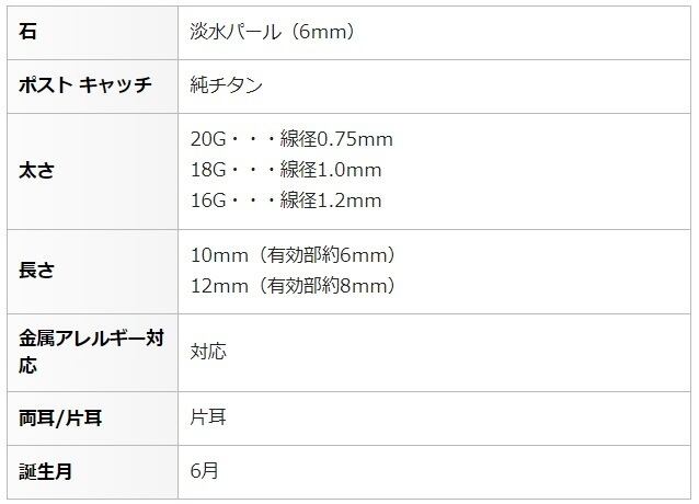 淡水パール セカンドピアス 6mm 純チタン 軸太 片耳販売です。