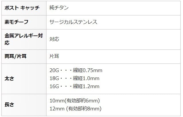 20G-10mm:線径0.75mm ポスト長さ10mm(有効部約6mm)