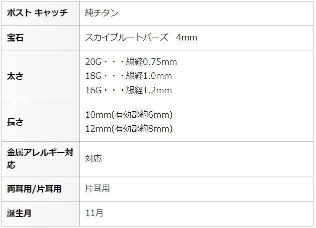 4mmスカイブルートパーズ セカンドピアス 純チタン 軸太 片耳販売です。