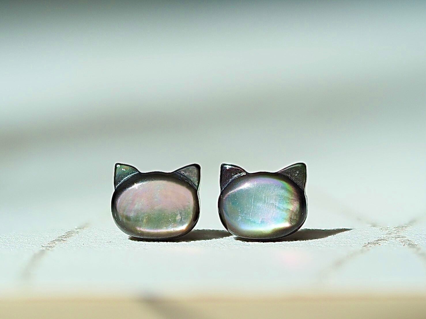 光のあたり方によって違う表情を見せる、気まぐれな猫にピッタリの貝、黒蝶貝を使用。